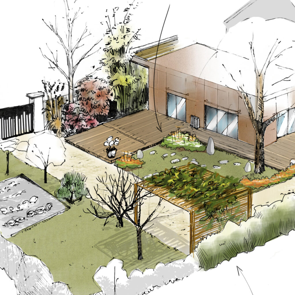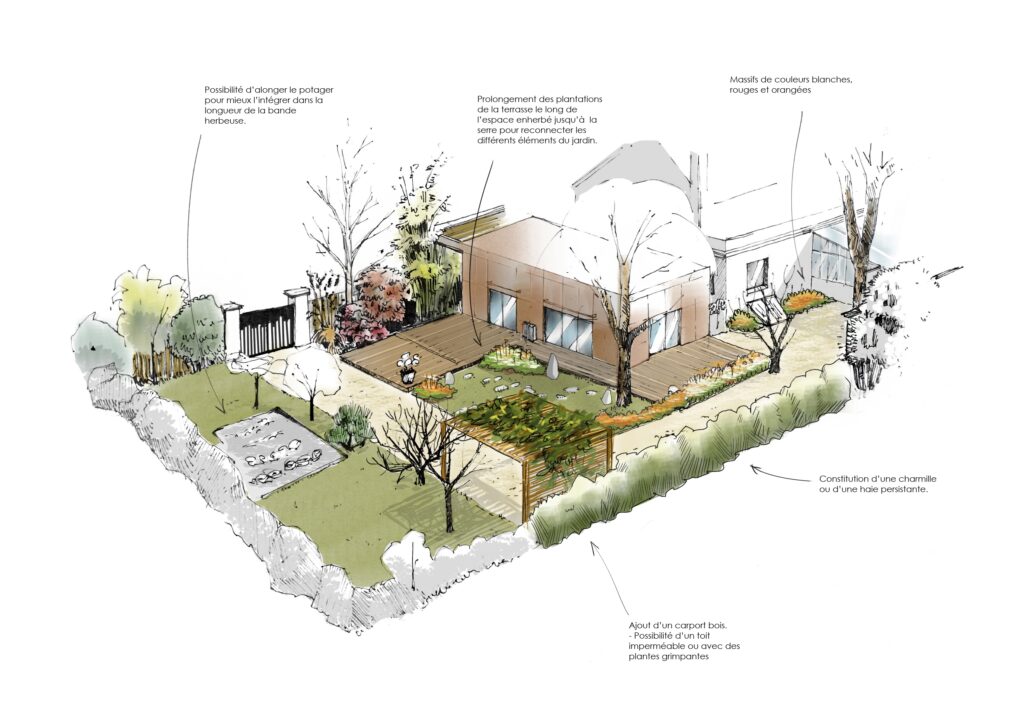 Conception d’une palette végétale et perspective de projection pour ce jardin de particulier aux tons cuivrés.