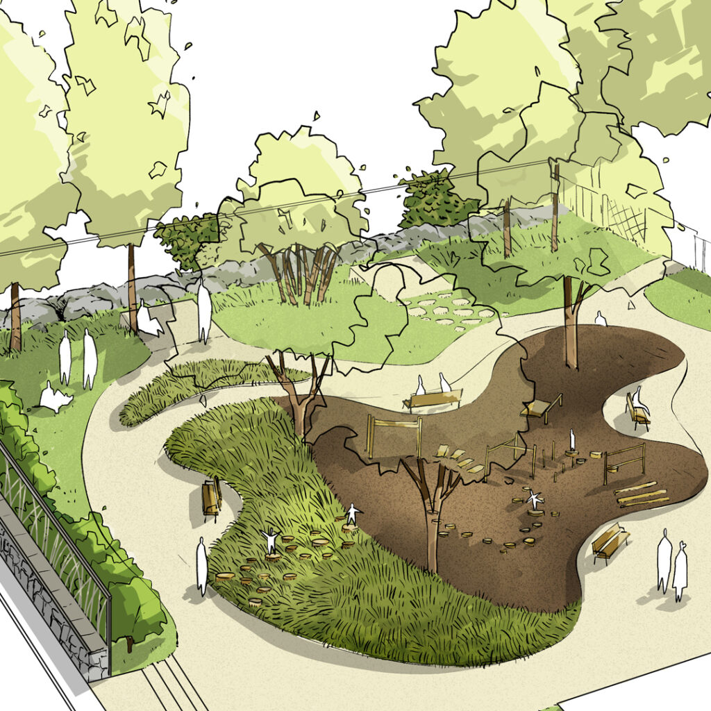Conception de deux scénarios pour ce petit parc urbain qui réunit ses habitants autour de nombreux usages : la promenade, le jeu, la rencontre, la détente dans un espace vert.